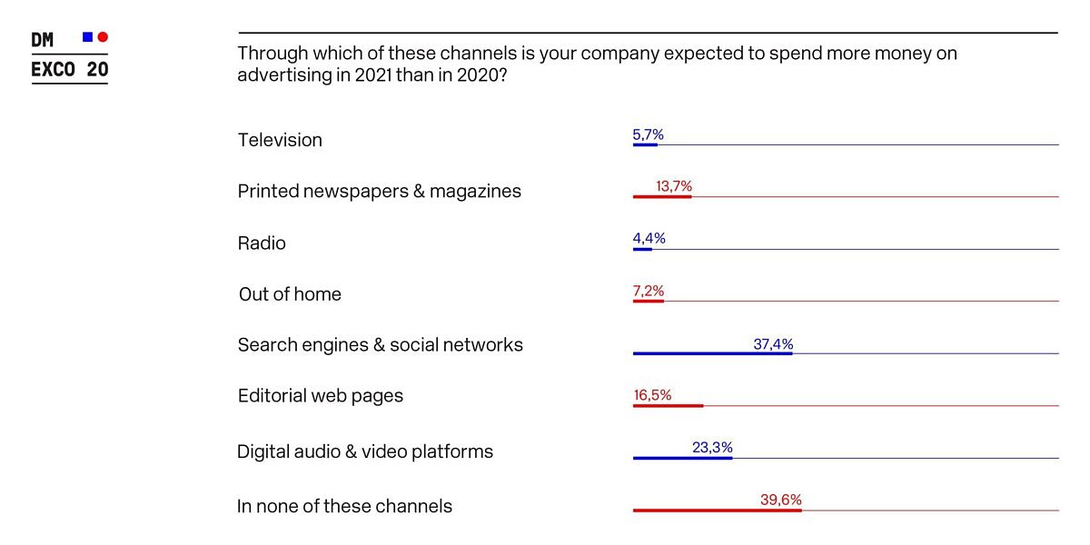 According to the survey, printed newspapers and magazines will still be the biggest losers next year: half of all respondents will be investing less money in print in 2021. Relatively smaller budgets are also predicted for radio and outdoor advertising. Traditional TV could also experience slight losses: 6 percent want to spend more money on TV advertising in their company next year; almost 12 percent want to invest less.