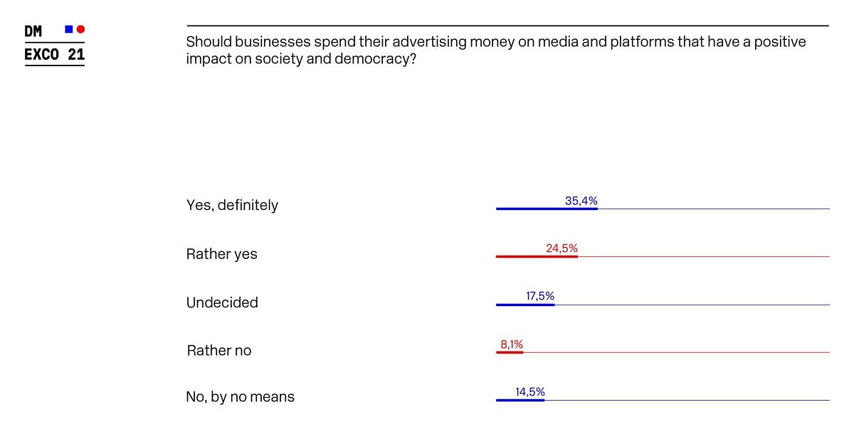 Should companies spend their advertising money on media and platforms that have a positive influence on society and democracy, thus demonstrating their attitude and setting a good example? Or should the advertising impact of media be the only factor that counts in the decision on which media to use? It turns out that the results of the online survey are unusually unequivocal for this target group: 60 percent of the marketers and communications specialists surveyed believe or tend to believe that the economy should spend its advertising money on media and platforms that have a positive influence on society and democracy. Just 23 percent say that businesses should not take this into consideration when allocating their advertising budgets. Those are the initial findings from a representative online survey commissioned by DMEXCO and conducted by market and opinion research company Civey.